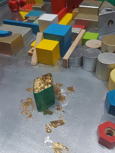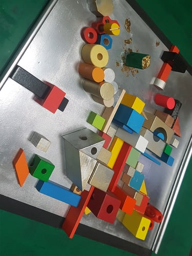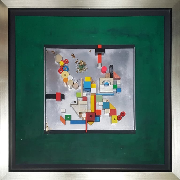 A mixed media composition built from cubes, circles, cylinders, and geometric forms, arranged in dialogue to express the delicate state of balance that shapes our lives.