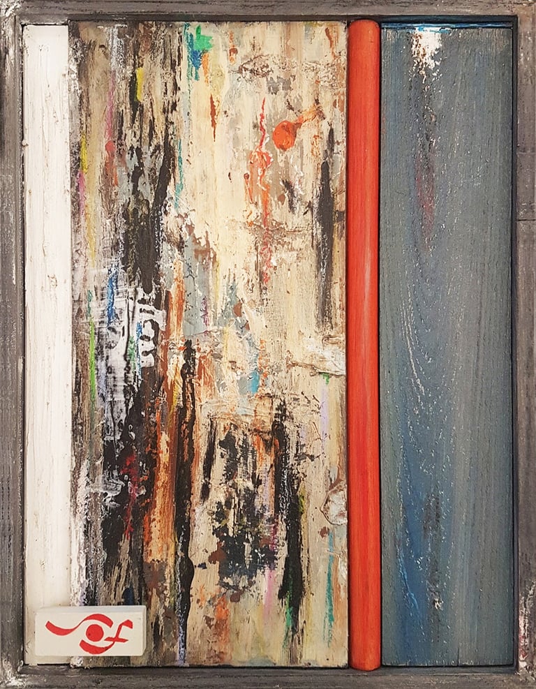 A mixed media artwork crafted from discarded wood materials, featuring a vintage fragment of wood from a fishing boat, combined with layered acrylic paints.