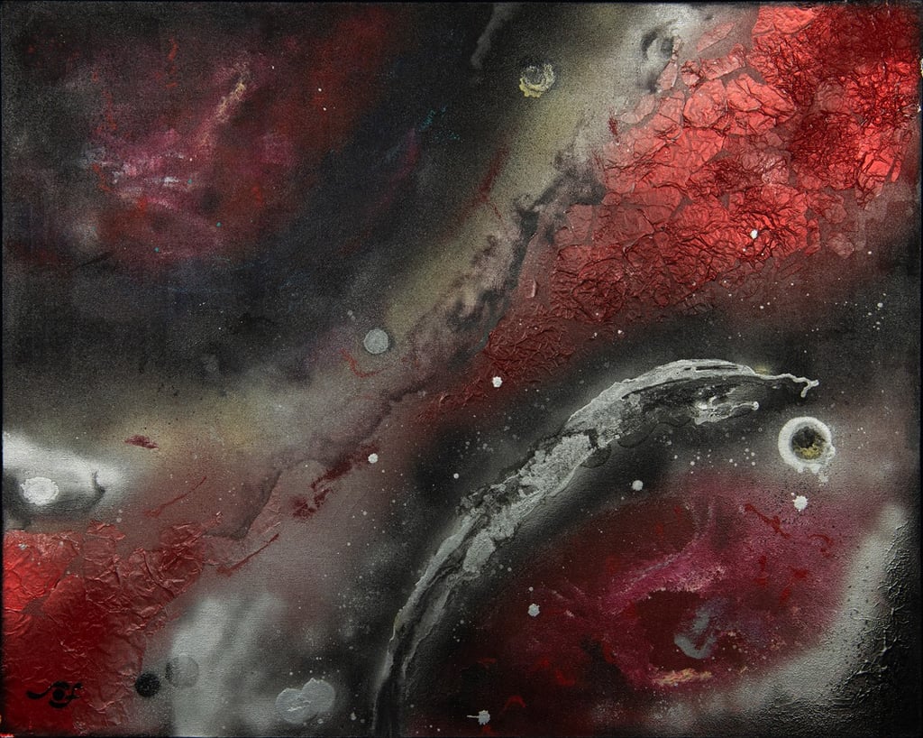 Deep red tones dominate the scene, infused with silver leaf and enriched by layers of black gradients that suggest a vast unknown, pulling the viewer forward like a road into stellar creation.