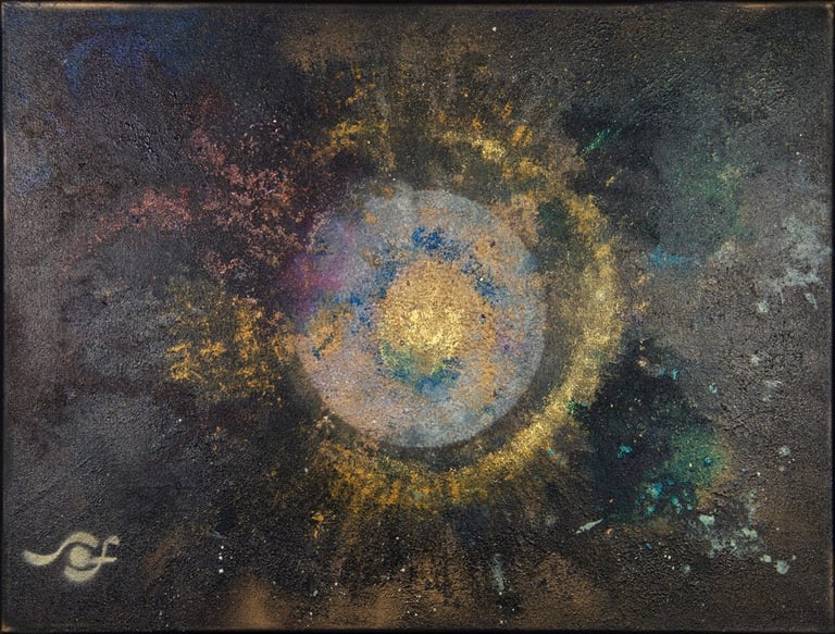 This artwork is a visual journey through the primordial forces of the cosmos-a reflection on the birth of a star, the swirling gas reactions, and the mysterious emergence of light from darkness.