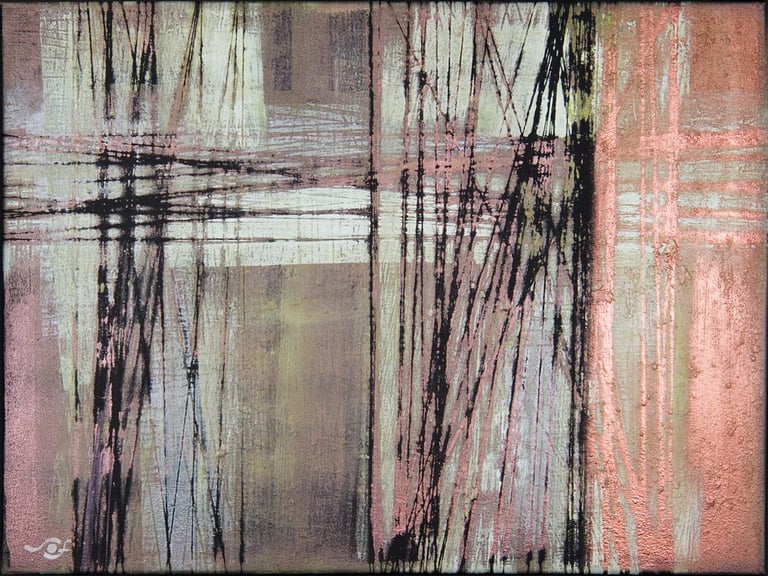 Here, muted backgrounds of warm neutrals, bronzes, and dusty pinks replace the starkness of black and white. The metallic pigment gives the surface a fragile sheen - a softness that contrasts with the strict lines that still traverse the canvas.