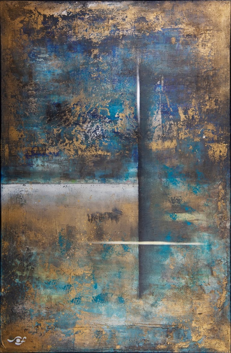 Technique: Acrylic and metallic paint with gold leaf on canvas